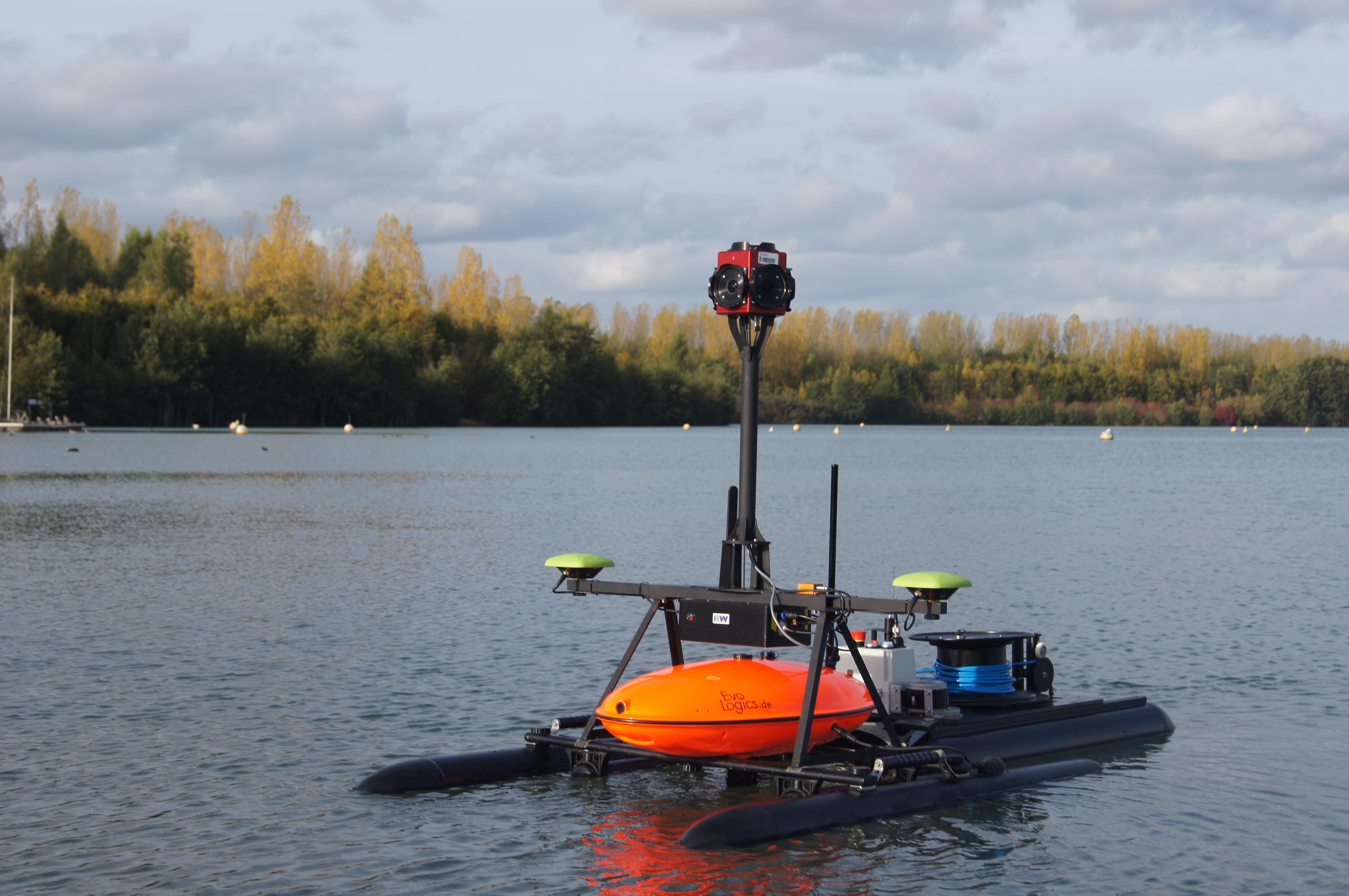 Das RiverView®-Projekt hat zum Ziel, einen ganzheitlichen Ansatz für ein gewässerzustandsbezogenes Monitoring und Mangement zu entwickeln. Dazu wurde ein Trägerboot entwickelt, welches in der Lage ist ferngesteuert und autonom kleine und mittlere Flussläufe zu befahren. Die Trägerplattform bildet ein autonom operierender Messkatamaran. Die eingesetzte Messtechnik vereint die gleichzeitige Aufnahme von georeferenzierten Aufnahmen, hydrophysikalischen und chemischen Messwerten, die Über- und Unterwassertopographie sowie die Überwachung von Gewässergüteparametern. Zwischen den beiden Schwimmkörpern ist eine Multiparametersonde der Firma SEBA Hydrometrie befestigt, um Wasserqualitätsparameter wie Temperatur, Sauerstoffgehalt, pH-Wert, Leitfähigkeit, Redoxpotenzial und Trübung kontinuierlich während der Messfahrt zu erfassen. Die mit dem Gesamtsystem gewonnenen Daten tragen maßgeblich zum System- und Prozessverständnis der Gewässer bei und bieten eine optimale Grundlage für die Gewässerüberwachung und Maßnahmenplanungen in und an Gewässern. [Bildquelle: Forschungsinstitut für Wasser- und Abfallwirtschaft an der RWTH Aachen (FiW) e.V.]